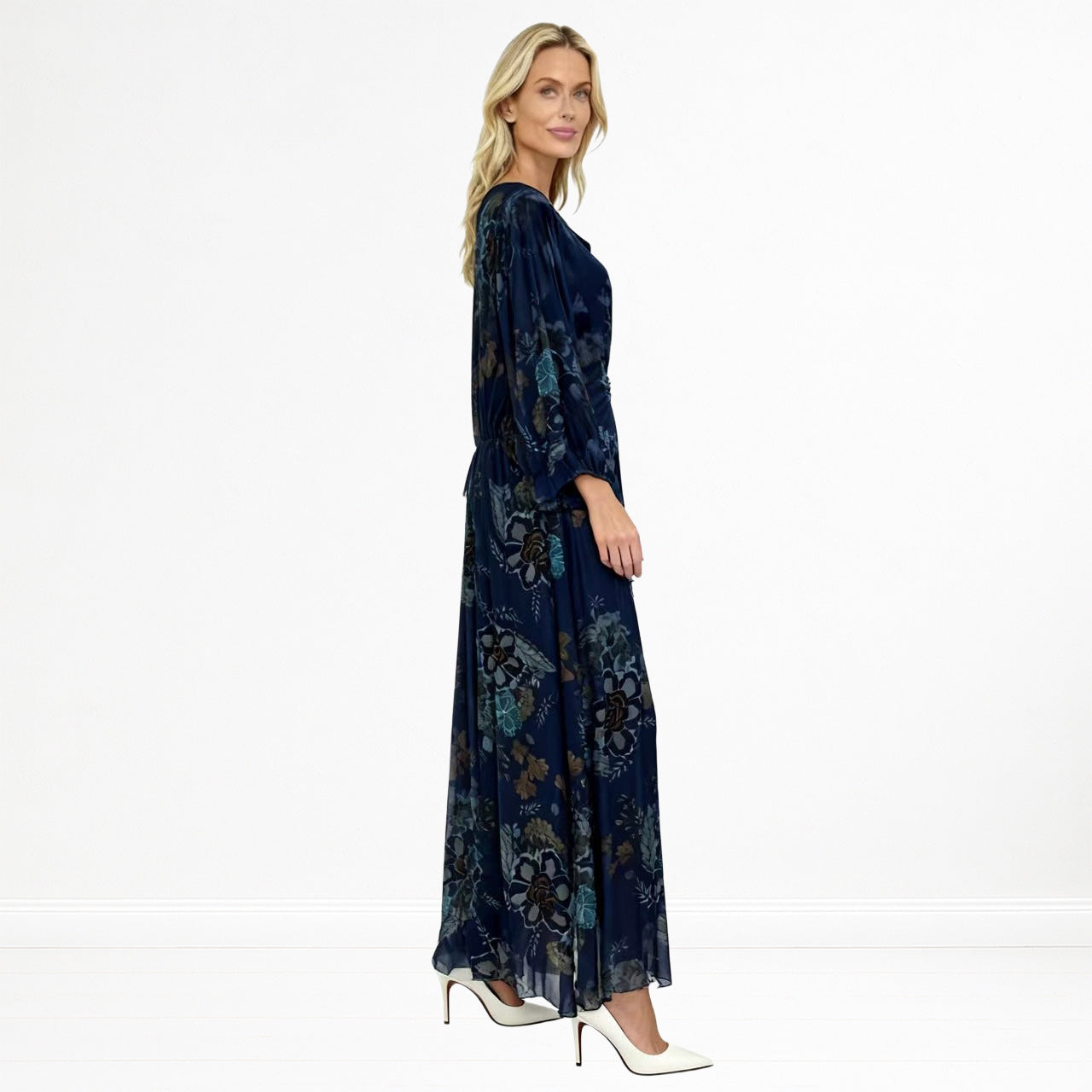 Elevate your wardrobe with this elegant navy floral dress, crafted from a luxurious blend of 30% silk and 70% viscose for a soft, lightweight, and beautifully draped finish. Featuring a refined cross neckline and a delicately knotted bodice, this design enhances your natural silhouette with effortless femininity. The navy base decorated with subtle floral motifs adds timeless charm, making it perfect for daytime occasions, weekend outings, or evening events. Comfortable, breathable, and effortlessly chic—this dress brings a touch of romance to any look.