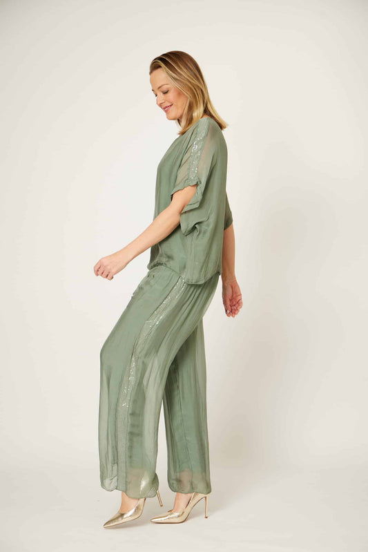 30% SILK 70% VISCOSE SEQUIN TRIM PANTS,KHAKI